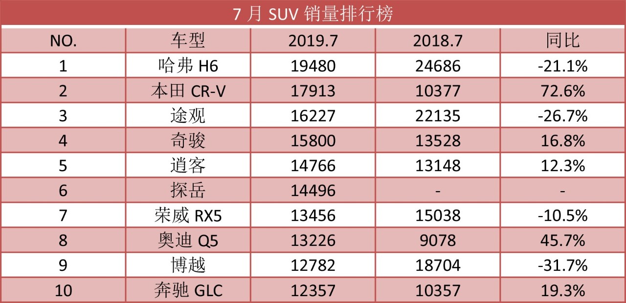 从榜单中可以看出,本田CR-V、奇骏 、逍客等经典日系车型仍保持稳中有升的状态,反之哈弗H6、吉利博越等自主品牌热销车型出现大幅下跌,其中哈弗H6虽重回SUV销量榜首的位置,但销量已经跌破2万。此外,在6月份以突破三万的高销量夺得SUV冠军宝座的途观,7月份则跌落到第三名,与探岳的销量差距也急剧缩小。