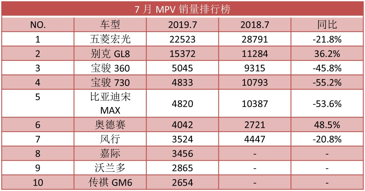在整体车市下滑的大背景下,MPV市场下滑最为严重,7月销量同比下降21.2%,依旧在拖整体车市的后腿。其中五菱宏光实现连续第9个年头夺得MPV销量冠军,但比起6月份的销量减少了近1万辆。在前十名中,只有别克GL8和奥德赛实现了同比增长,其中奥德赛在今年上半年实现了全新升级,并紧接着推出了混动车型,成为合资MPV中首款混动车型,也为其销量提升奠定了基础。