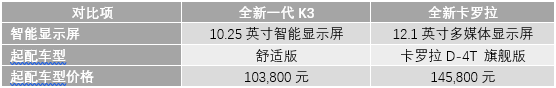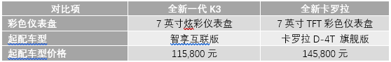 结语:作为国内紧凑型轿车市场的时尚先锋,全新一代K3和全新卡罗拉都拥有超高的颜值,各具特色,基于外型的评判都带有较大的主观色彩,难分高下。而车载智能设备就不一样了,在车型配置和功能实现上就是硬指标,高下立判。从上述对比中,可以明显的感受到全新一代K3在配置和科技感打造上的诚意满满,并且,从对比表中还可以看出,相似的配置,全新一代K3价格远低于全新卡罗拉,这让前者又拥有了超高的性价比。谁才是智慧汽车达人,答案显而易见。