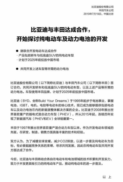 7月19日,比亚迪与丰田共同发布达成深度合作的协议,将共同开发纯电动版本的轿车和低底盘SUV产品,以及这些产品所需要的动力电池。按照计划,双方合作开发的纯电动新车,将在2025年前在中国市场进行投放。据称,比亚迪与丰田将就研发、生产、销售纯电动车成立合资公司。合资公司将负责以比亚迪e平台为基础的纯电动车生产、销售,产品挂丰田标识,以及与之配套的动力电池研发工作。