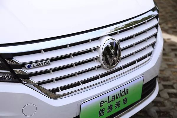 让我们从外观造型来了解上汽大众的第一款纯电车型吧。基于燃油版车型打造的朗逸纯电(e-Lavida),在外观和尺寸上并没有太多变化,仍然是我们非常熟悉的大众脸,但前脸格栅换用了类似于“百叶窗”的白色镀铬饰条,并在边沿上加上“e-LAVIDA”的铭牌来彰显纯电动身份。这样的设计比燃油版上横贯式的镀铬条精致不少,也比多数纯电动车封闭式前脸让人更容易接受一些。