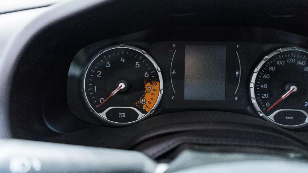 还有个比较有特色的就是仪表盘了,它是传统的机械式仪表盘,但是设计上花了一些小心思,例如转速表在7、8000转的时候不是红线区域,而是更能彰显越野的泥黄色设定,并且仔细看两个表盘的外环,凹陷的雕刻很有金属感,整个仪表盘虽然很原始,但是不缺乏设计上的小心思。