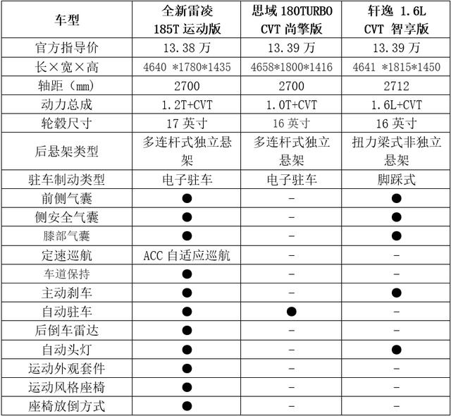 外观设计看个人审美,那么配置方面则是决定不同车型质价比的关键所在。若手持13万多的购车预算,那么你可以选择全新雷凌运动版(13.38万元)、思域180CVT尚擎版(13.39万元)以及全新轩逸智享版(13.39万元),三个配置车型的售价几乎持平,差异在配置和用料上,那谁能更得消费者的心呢?