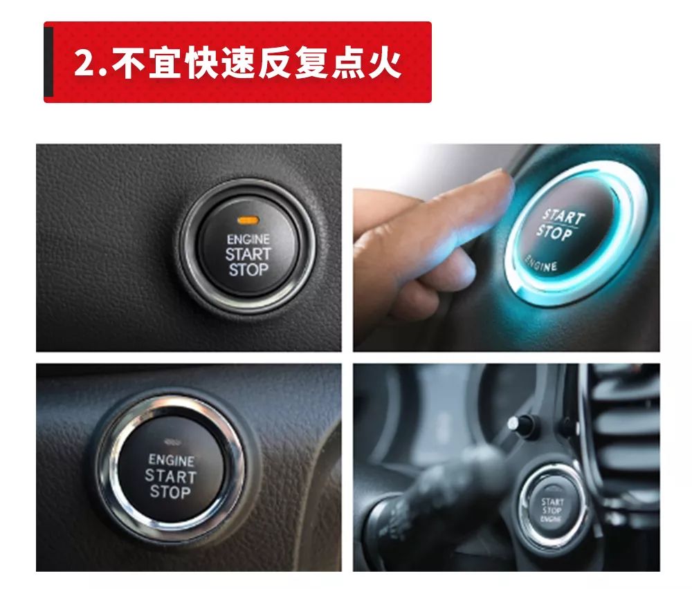 在启动汽车时,每次发动的时间不宜超过5秒,再次启动的间隔时间不少于15秒,否则不间断的使用起动机会导致电瓶过度放电而损坏。