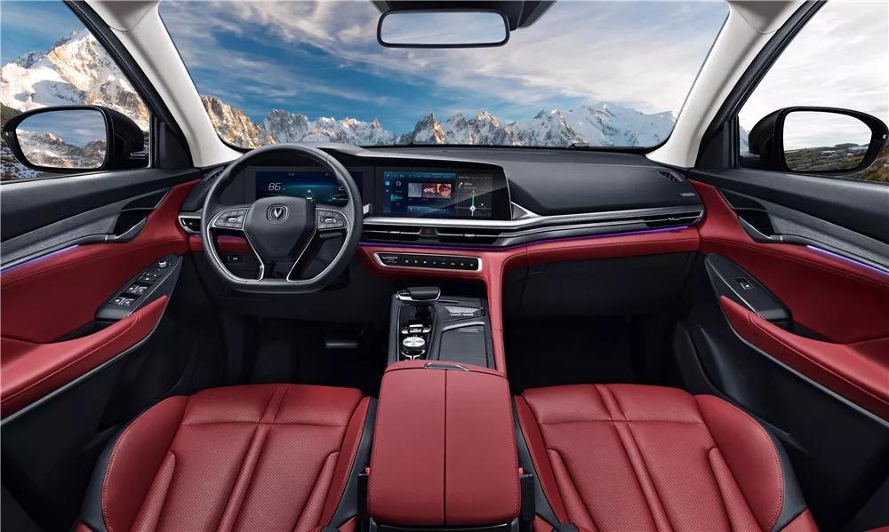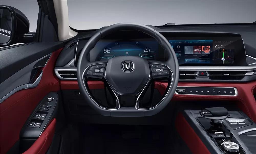 进入到CS75 PLUS的车内,红、黑双色搭配的内饰配色配合三幅式平底方向盘,很能激发你的驾驶欲望,中控台也向驾驶席稍作倾斜,给到驾驶员更强的专属感。中控台上两块12.3英寸的大屏幕组成了连体屏,科技感很强。