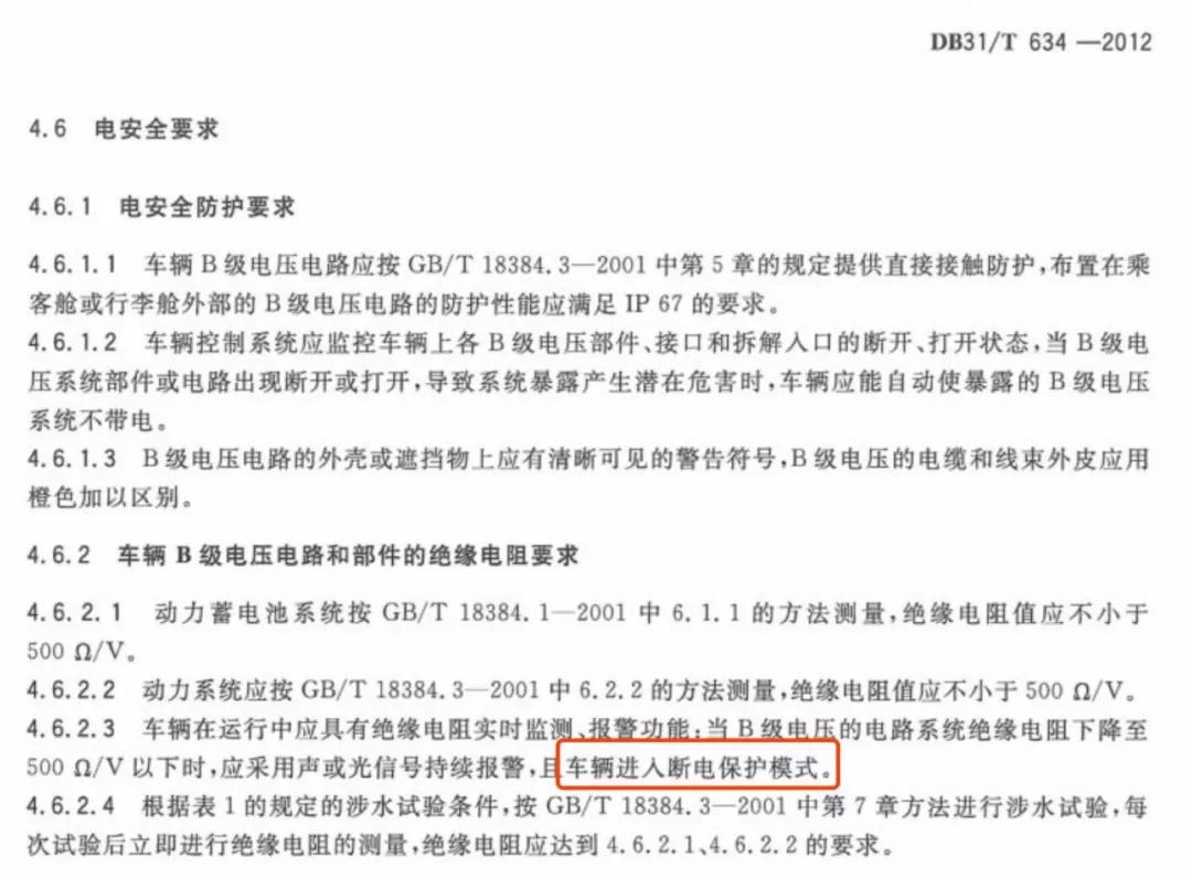而在北京或上海,还有针对电动车更加严苛的制造要求。比如上海的《电动乘用车运行安全和维护保障技术范围》(DB31T634-2012)中就有如下规定:布置在乘客舱或行李舱外部的B级(高压)电压电路的防护性能应满足IP67的要求。