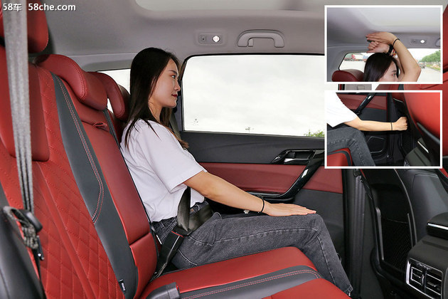 保持前排座椅不变,同一体验者来到后排,头部剩余一拳四指的空间,而腿部空间的表现就非常宽裕了,足足有半臂的距离。