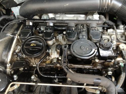 发动机表面的油渍不算漏油也不算渗油,成因是加注机油时的习惯不好,如果使用漏斗,加注完毕后擦拭干净就不会出现这个问题。