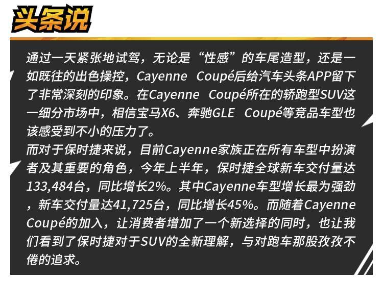 而在此背景下的SUV级别中,诸多品牌还衍生出了另一个细分市场,那就是具有溜背设计、Coupé车身的“轿跑型SUV”。在宝马X6 (配置|询价)、奔驰GLE (配置|询价) Coupé等豪华品牌的轿跑型SUV已经在市场中“摸爬滚打”多年后,保时捷Cayenne也终于向这一细分市场进军,推出了Cayenne Coupé来进一步抢占份额。