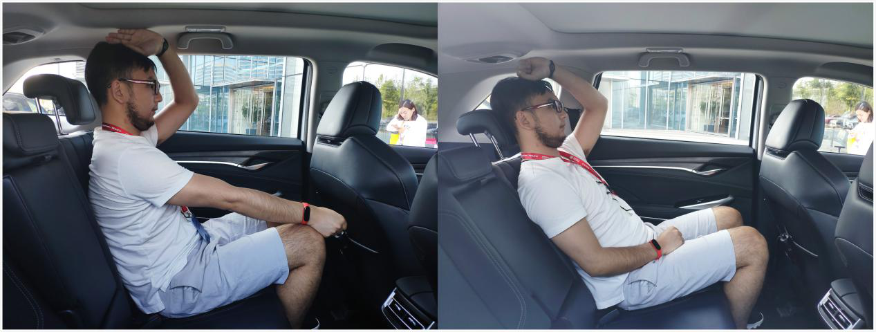 后排座椅支持多角度调节,最笔直的情况下,头部空间大致四指左右,腿部空间两拳以上,而调整到最靠后的座椅角度,头部空间明显得到巨大的改善。
