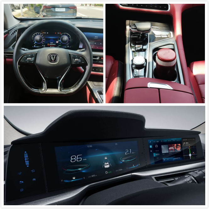 中控采用了沉浸式三联屏的设计,由双12.3英寸全高清视网膜大屏以及左侧触控屏组成,与传统中控屏设计不同的是,CS75PLUS采用以驾驶员为核心的8.1°弧度设计,更符合感官体验,带来更好的驾驶关怀。