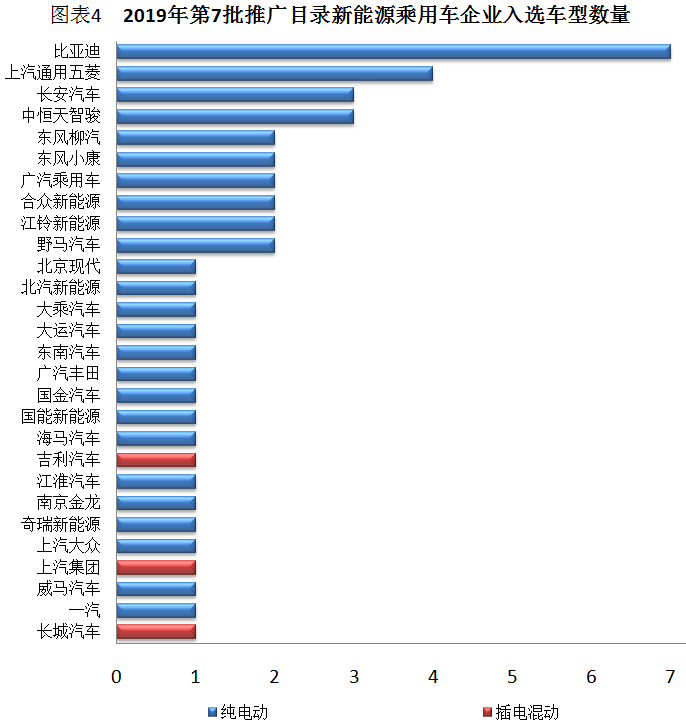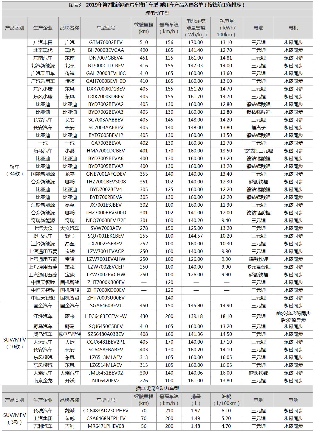 在2019年第7批推广目录中,乘用车车型共47款,其中,纯电动车型有44款,插电式混合动力车型有3款。