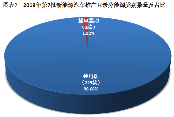 从能源类别来看,纯电动车型为225款,占比98.68%;插电式混合动力车型共3款,占比约1.32%。(见图表2)