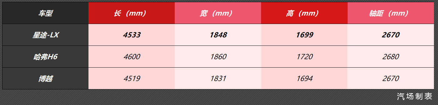 与哈弗H6相比,星途-LX长度比哈弗H6短了67mm,轴距短了10mm。