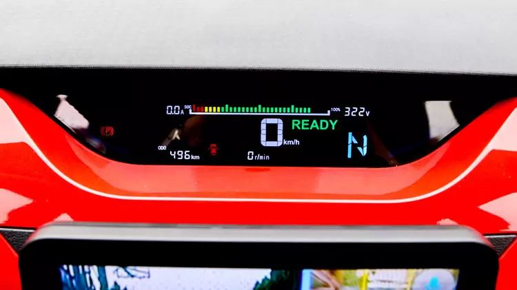 内饰设计非常独特,中控台采用中心对称设计,小小的仪表盘被设计在中控上,能显示剩余电量、续航、挡位等重要的行车信息。不过开车过程中只看方向盘后边的 HUD 抬头显示就行,这些重要的行车信息都会在 HUD上显示。