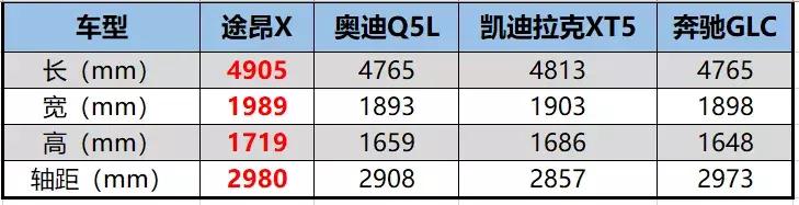 对比终端售价接近的奥迪Q5L、凯迪拉克XT5、奔驰GLC,我们不难发现,途昂X拥有着“空间吊打对手”的越级优势。