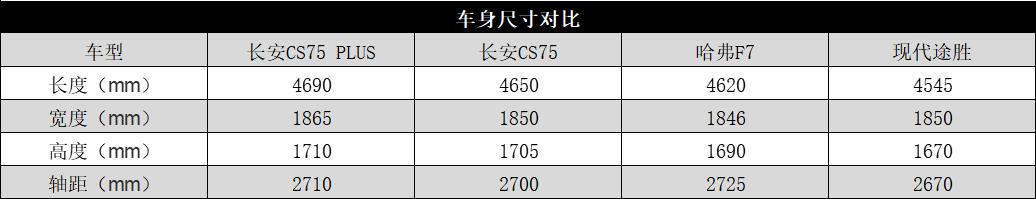 车身尺寸方面,长安CS75 PLUS长宽高分别为4690/1865/1710mm,轴距为2710mm,与同级产品相比,在车身尺寸方面还是具有些许优势的。更大的车身尺寸也带来了更大的空间,新车后备箱空间高达620L,在后排座椅放倒之后,可增加至1450L,满足了家庭日常使用。