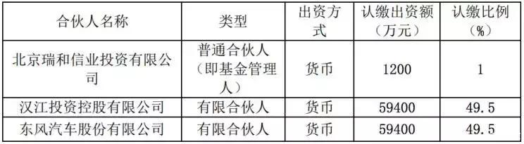 基金总出资额为12亿元人民币,首期出资6亿元,后期依据子基金的设立情况分期出资。其中,东风汽车股份有限公司和汉江投资控股有限公司作为有限合伙人,两家企业认缴出资额各为5.94亿元,认缴比例各占49.5%。北京瑞和信业投资有限公司作为普通合伙人出资1200万元,认缴比例为1%。