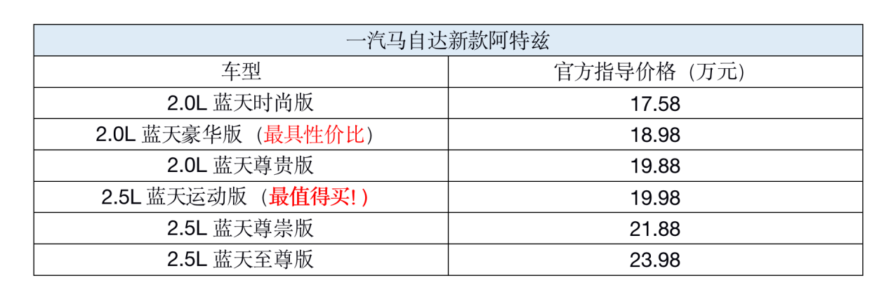 2.5L蓝天运动版 售价:19.98万元