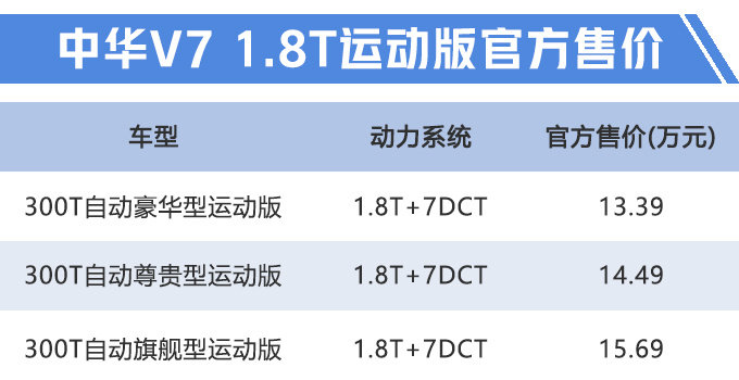 8月23日,华晨中华V7 1.8T运动版正式上市,共推出3款配置车型,官方售价区间为13.39-15.69万元,新车价格相比同样配置1.8T普通版车型上涨0.2万元。中华V7 1.8T运动版基于与宝马合作开发的M8X模块化平台打造,整体尺寸比宝马X1 (配置|询价)还大,动力方面搭载1.8T发动机(衍生于宝马N18B16发动机)。