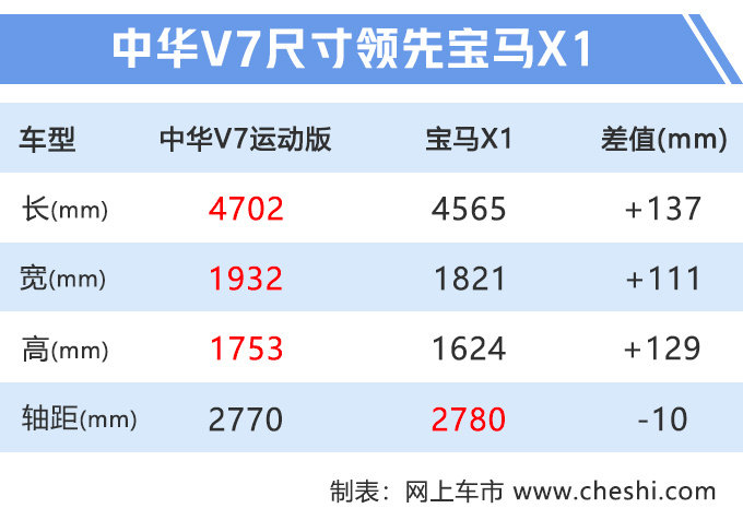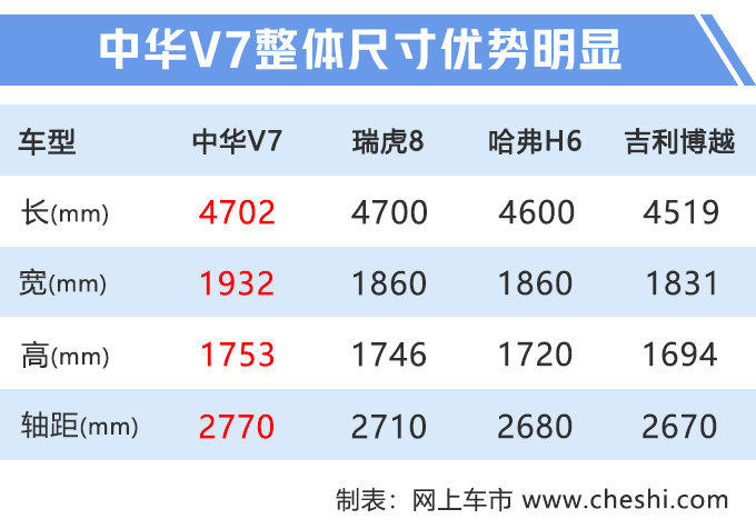 中华V7 1.8T运动版定位中型SUV,但主打A+级SUV市场,相比奇瑞瑞虎8(B级)、哈弗H6(A+级)、吉利博越 (配置|询价)(A+级)等竞品空间优势比较明显。动力方面,中华V7运动版搭载由宝马调教过的1.8T发动机,传动系统匹配与宝马X2相同的7DCT变速箱。新车8.5秒的百公里加速成绩、7.2L的百公里油耗表现,都大幅领先哈弗H6、吉利博越、奇瑞瑞虎8等竞品。
