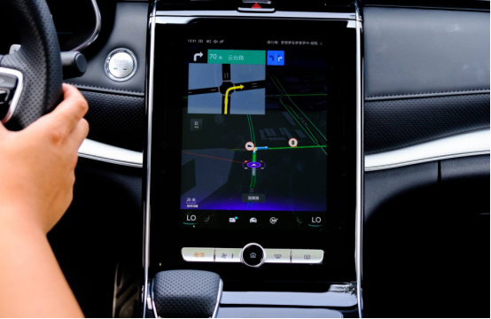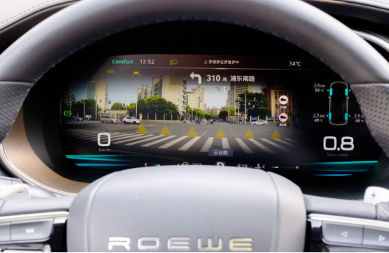 比如在我们的自由试驾过程中,荣威RX5 MAX可以准确定位我们的所在位置和具体车道,还原道路的真实场景,并将车辆状态、驾驶引导、环境感知等信息叠加在真实场景中,即使遇到复杂路况的时候,它也会及时提醒我们,避免我们走错路。