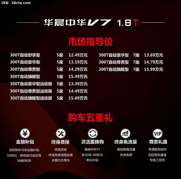同时,华晨中华还特别推出购车“五重礼”,除贷款购车可享受至高5000元的金融补贴外,还可享受终身质保、置换补贴、终身免基础流量、专属服务等。