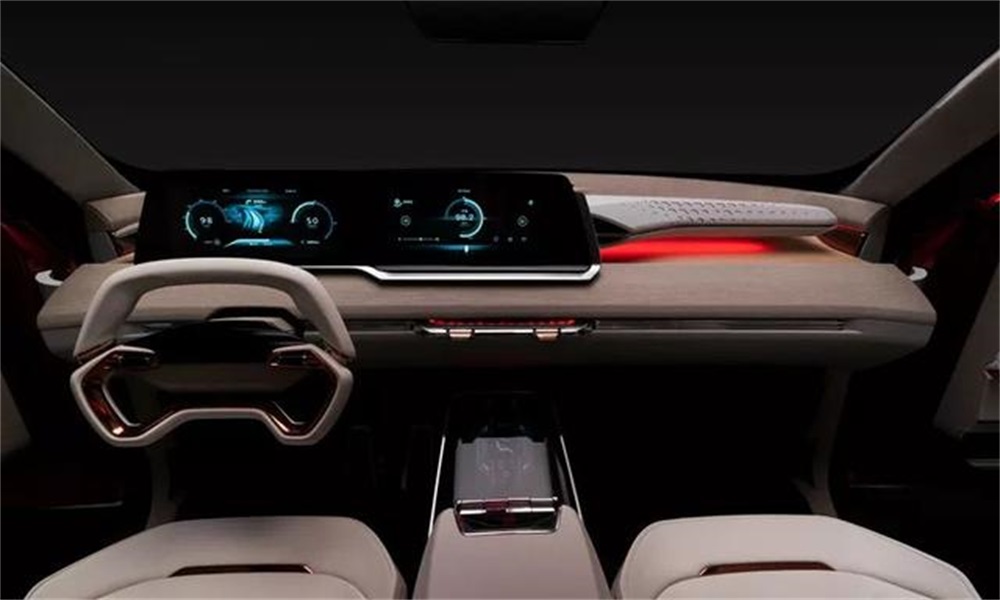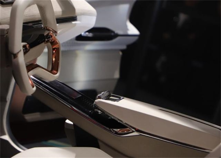 打开车门,新车采用对开式车门设计,中控部分配有24英寸的大尺寸的横贯式屏幕,方向盘造型别具一格,满满的科技感。全车并未加入物理按键,当然这只是基于概念车,如果量产的话,相信会与概念车有所区别。