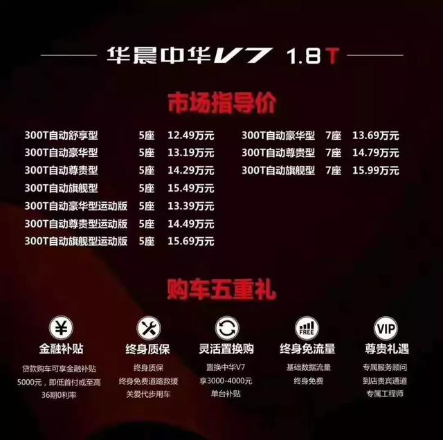 8月23日,诞生于华晨中华M8X模块化平台的“德式驾控中型SUV”中华V7-1.8T车型在北京正式上市,共推出舒享型、豪华型、尊贵型、旗舰型四款车型,搭载独有宝马核心技术的1.8T发动机,官方指导价为12.49万元-15.49万元。