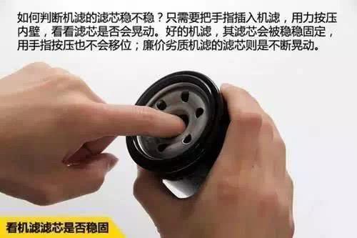 好的机滤,滤芯的固定会很牢固,因此用手指去轻轻按压机滤的滤芯,可以感受到滤芯的牢固程度,以此来判断机滤的好坏程度。另外,也可以将机滤放在耳边摇晃,听机滤内部摇晃的声音,如果出现很多嘈杂的、干涉的声音,这说明被摇晃的机滤是劣质产品。好的机滤的滤芯材质密度更好,过滤效果更好。同时,好的机滤滤芯更大,过滤面积更大。