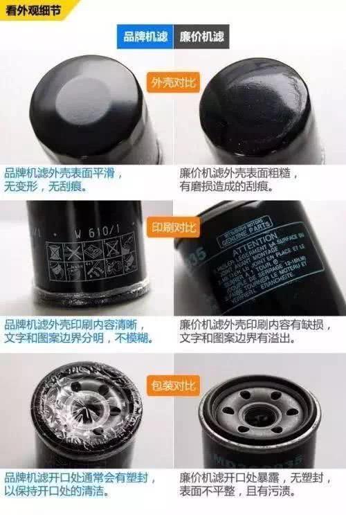 两个不同价钱的机滤在外观上看似乎都是一个铁罐子,但是好的机滤表面的漆面很光滑,廉价的机滤表面的漆面比较粗糙。好的机滤壳体上印刷的文字很清晰,但是廉价的机滤印刷质量很差,文字图案会有很多模糊的地方。最后就是包装上好的机油滤芯要比廉价的机油滤芯好很多。