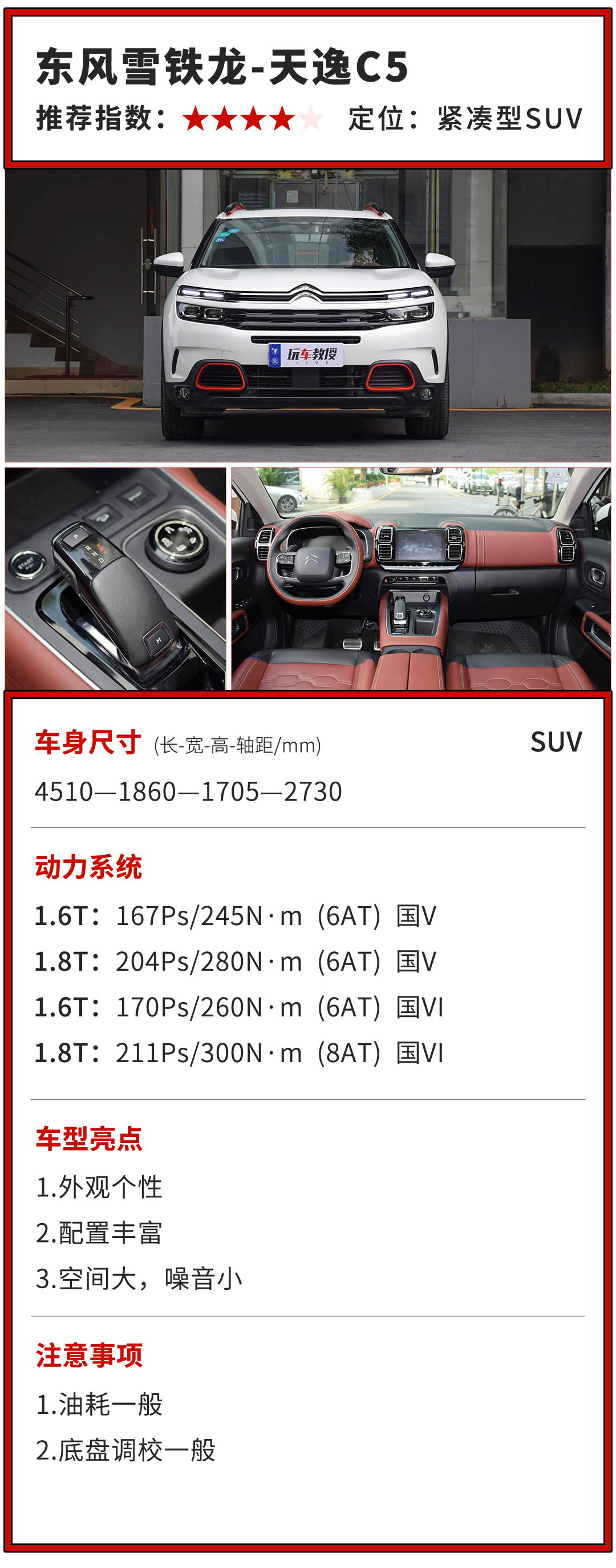动力上,雪铁龙天逸C5共搭载了两款动力,分别是1.6T和1.8T的发动机,不过因为国VI的原因,在原有动力上有了一些升级。目前国VI版本的动力,1.6T最大功率为170马力,1.8T最大功率为211马力,还是能满足日常行车要求的,不过在燃油经济性方面还是差上一些,而且它的底盘调校偏软,过小沟小坎会出现较大的颠簸情况。