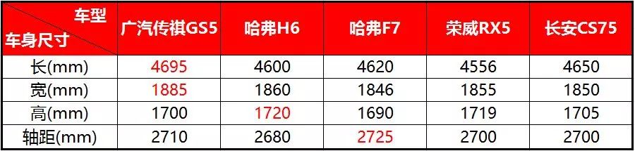 车身尺寸方面,GS5在长度和宽度上均超越另外四位对手,而在高度和轴距大小方面,虽然不是最大,但仍处于中上水平。可以说GS5在车身尺寸方面也是占尽优势,并不羸弱。