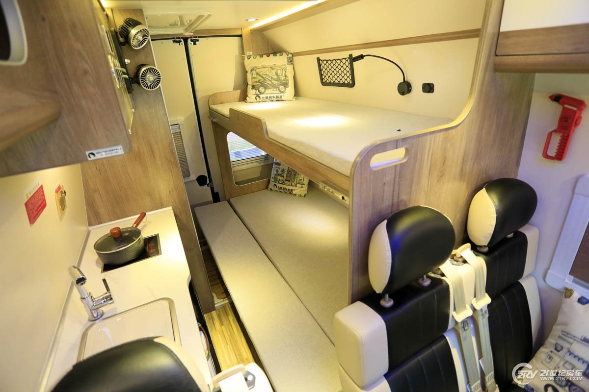 作为一款B型房车,新车采用了空间利用率更好的纵置子母床布局,车厢前部为客厅区域,厨房区及卫生间也配置齐全,位于车厢后部。新车采用了整车轻量化板材家具,水箱则采用不锈钢材质,车顶设有350×350(mm)换气扇。