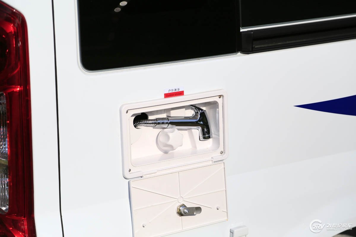 新车在车身右侧配备了外置淋浴,适用于在海滩城市旅行时,方便乘客在进入房车前冲净脚上的沙子。