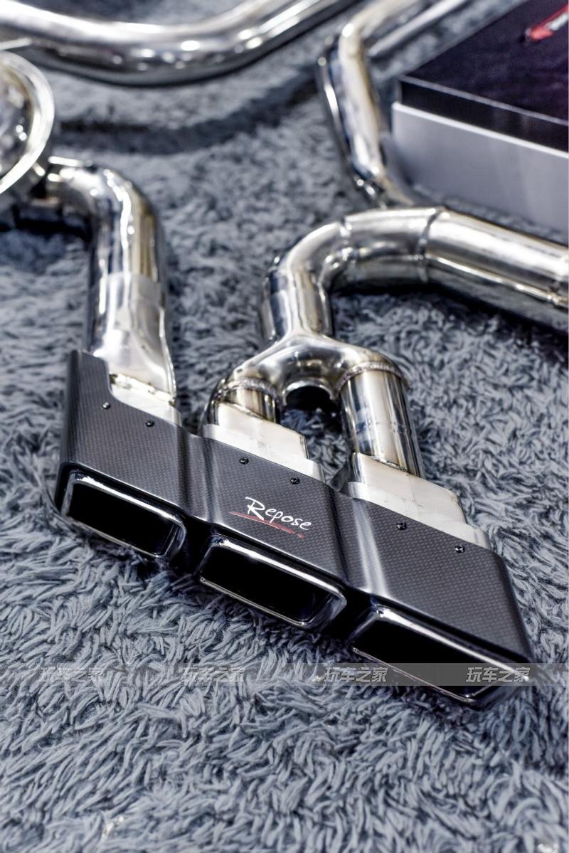 双边六出碳纤尾喉,Repose排气主打性能与做工,从弯曲的连接焊接处就可以看出其德国工艺