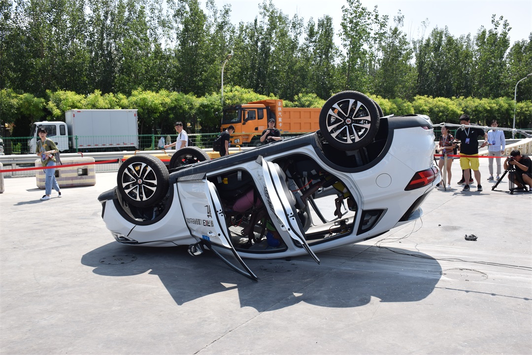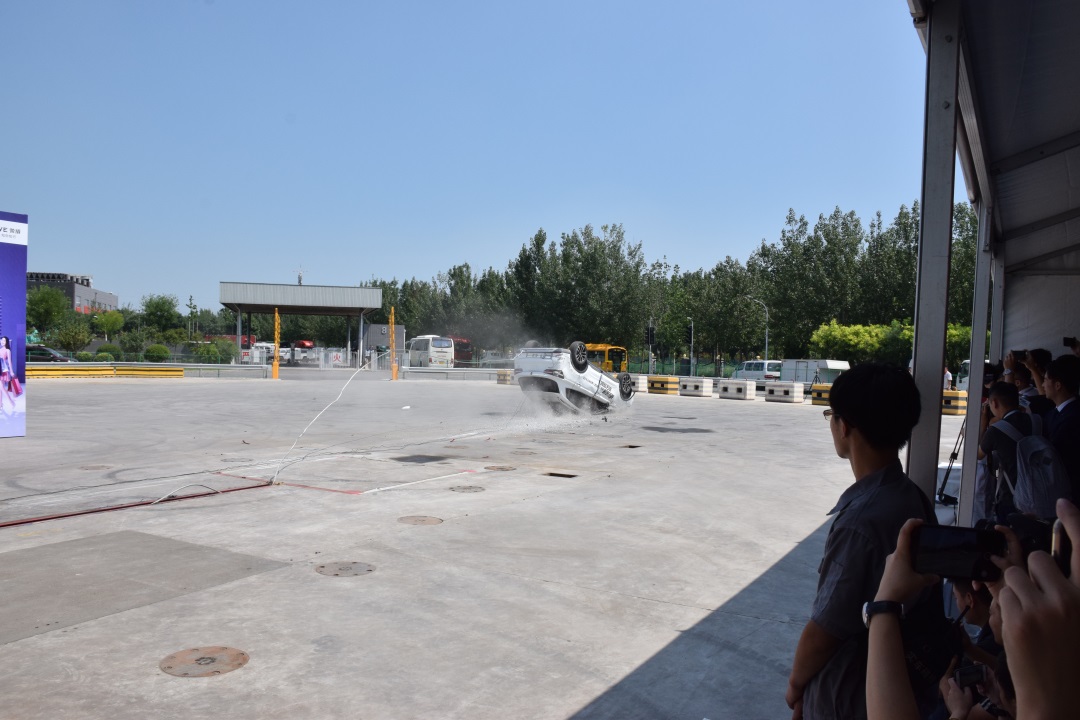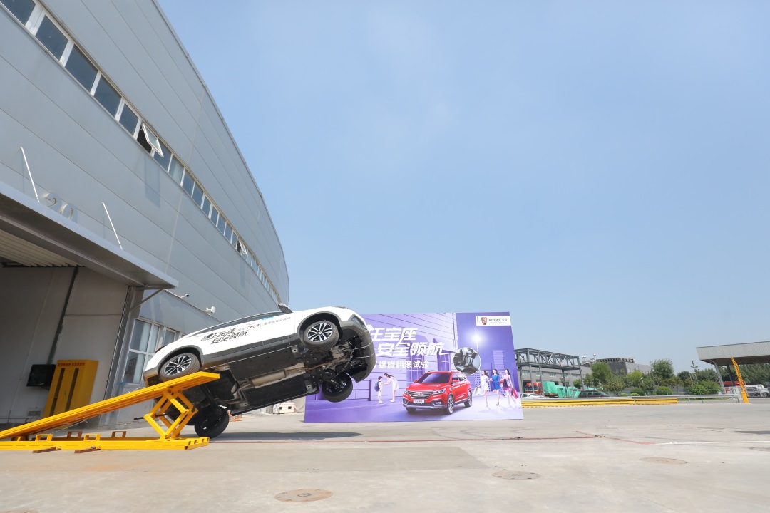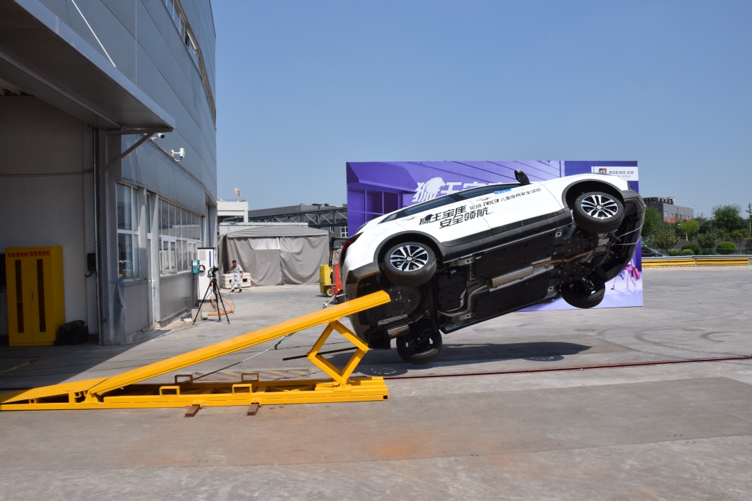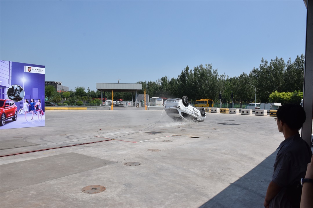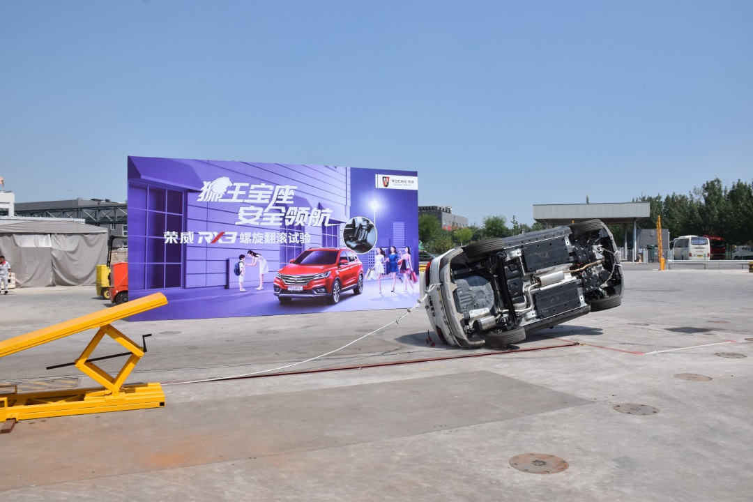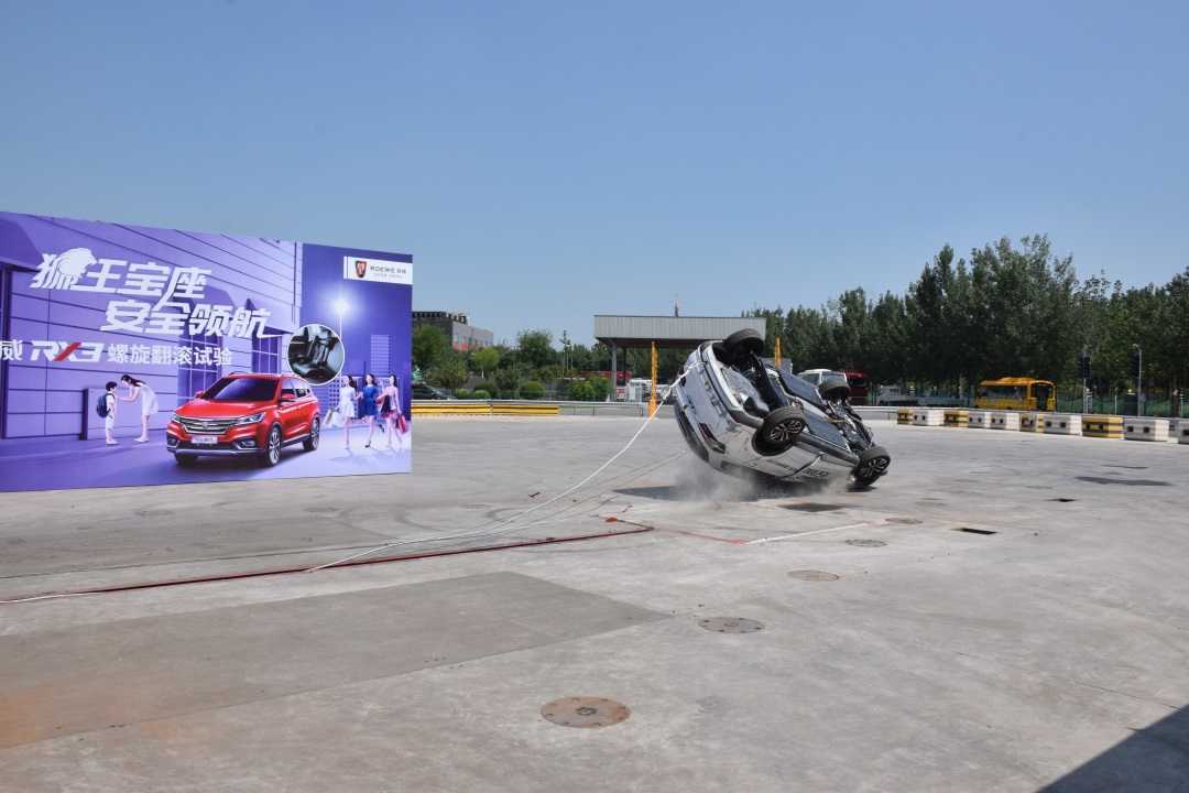 接下来的这个试验应该是教授看过的最接近电影中飙车戏码的测试了。在螺旋翻滚试验中,荣威RX3搭载两个男性假人,以及后排乘坐在一体式儿童座椅上的Q3儿童假人,以5.5km/h的时速冲上倾斜角为16度的壁障,模拟车辆发生侧翻的一种交通事故形态。