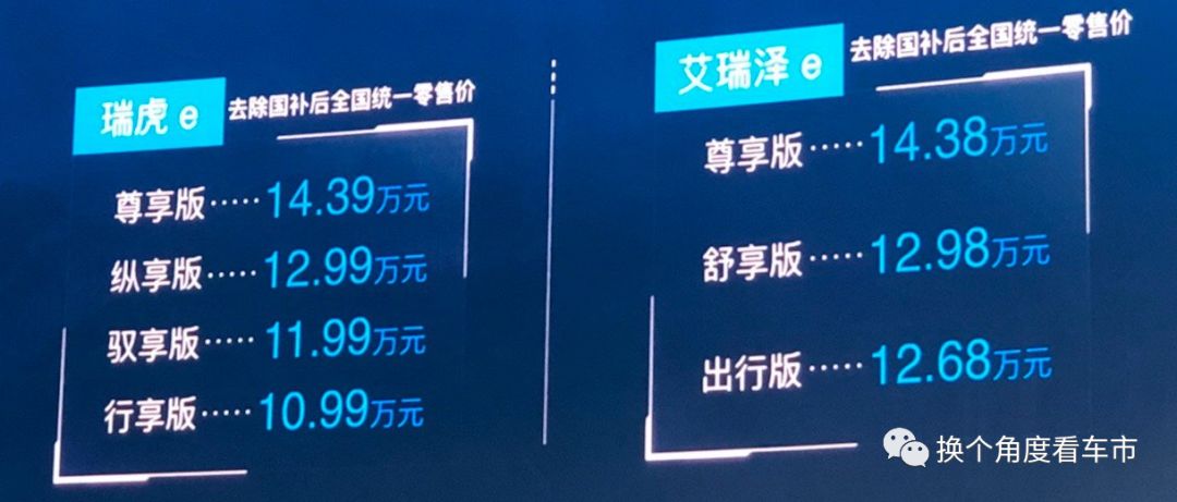 8 月 25 日,奇瑞在北京举办上市发布会,旗下新能源瑞虎e、艾瑞泽e (配置|询价)已正式上市。其中瑞虎 e 推出四个配置,补贴后 10.99-14.39 万元;艾瑞泽 e 推出三个配置,补贴后 12.68-14.38 万元。