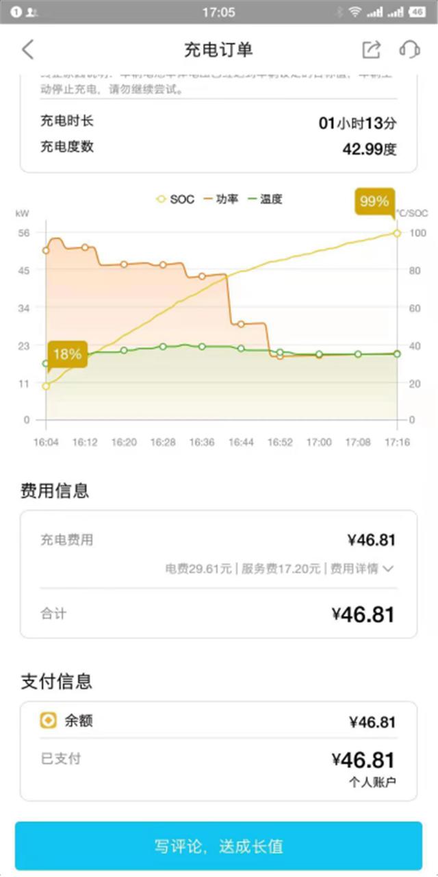 然后是充电的费用:这次充电的电桩每度电1.09元(含服务费),从15%到充满一共花了46块多。如果是在家里充电的话,每度电5毛,43度电也只需要21.5元。按照实际350公里的续航里程来算,每公里费用也才0.06元。