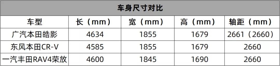 本田皓影的长/宽/高分别为4634/1855/1679mm,轴距为2661(2660)mm。整体尺寸比大家熟悉的东风本田CR-V (配置|询价)、一汽丰田RAV4荣放 (配置|询价)大上了一点。