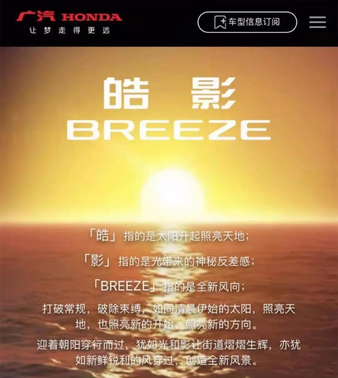前段时间工信部公布了广汽本田全新SUV的申报信息,当时我们通过申报图也能了解到这款新车的英文叫BREEZE (配置|询价),但没有一个中文名很难给国内消费者留下深刻的印象。近日,广汽本田正式公布了旗下全新紧凑型SUV的中文名命名——皓影。至于为什么取名为皓影,看看广汽本田的官方解释吧。