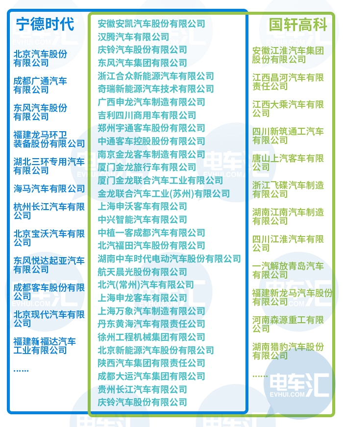 当然,大众也没有完全排除宁德时代。2018年初,大众集团MEB项目宣布定点宁德时代。不过整车厂在选择供应商之时AB供是常规操作,电车汇数据库显示,有数十家整车厂既是宁德时代的客户也是国轩高科的客户,由两家企业共同为其供应电池。
