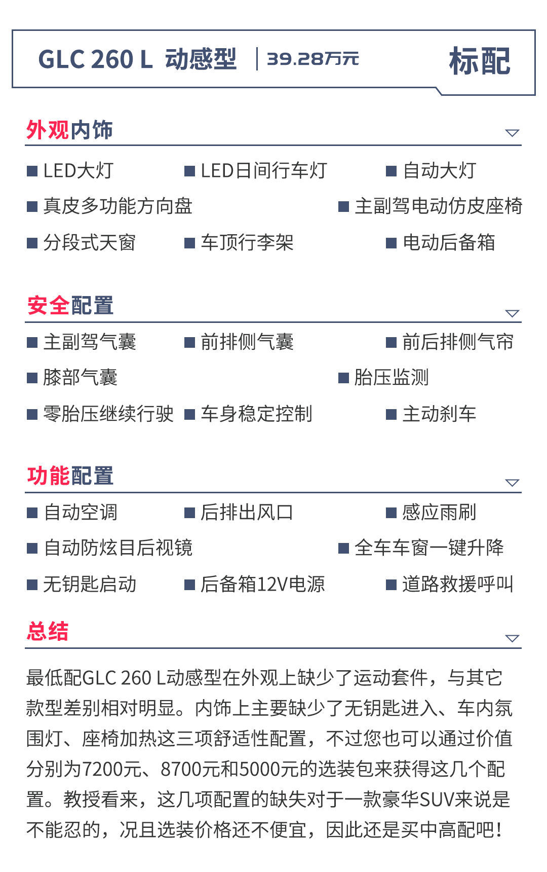 最低配车型的存在往往只是为了拉低价格门槛,真正购买的用户并不多,何况是奔驰这样一个豪华品牌,你总不想在大庭广众之下还得掏钥匙开车门,女朋友或老婆大冬天或者生理期来了连座椅加热也没有,对你印象分大减吧!