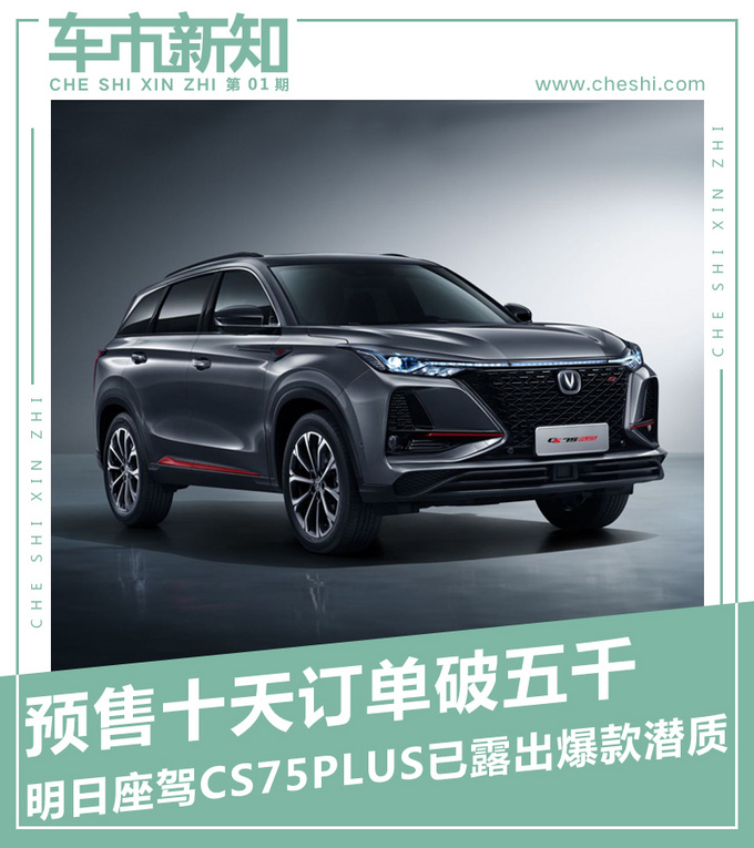 在整体市场表现不佳的大环境下,许多车企似乎都进入到了一个怪圈当中,急于挣脱困局的束缚,却又找不到正确的突破口,于是在这个怪圈中循环碰壁。就在我们快要对这种状态麻木的时候,一款定位为A+级SUV的明日座驾——长安CS75PLUS (配置|询价)进入到了人们的视野,虽然仅是预售阶段,但史无前例的预售政策、厚道的预售价格,给我们带来惊喜的同时,也带来了困局中的光亮。目前预售10天,订单量就已经突破了5000辆,CS75PLUS这款明日座驾已经展现出了爆款潜质。