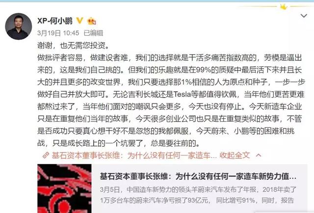 处于投资行业的张维,对于资本和市场,本该具备更强敏锐的嗅觉。无论张维是否触碰到了何小鹏的敏感带,还是看穿了目前国内造车新势力的一地鸡毛,这样的告诫无疑不失一种“出示黄牌的警告”。