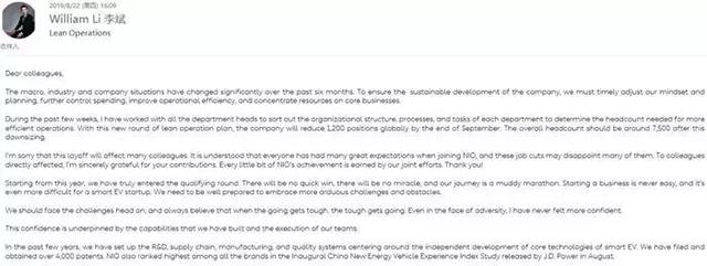 邮件内容大致是,“按照进一步的精益运营计划,九月底前公司在全球范围内将减少1200个工作岗位。调整后公司的人员规模大概在7500人左右。”李斌在邮件中还委婉地告知同事们,“从今年开始,我们真正进入到了资格赛阶段。不会有速胜,不会有奇迹,我们的征途是泥泞赛道上的马拉松。创业从来不是容易的事,智能电动汽车的创业更是难上加难,大家要做好迎接更艰难挑战与更多挫折的思想准备。”