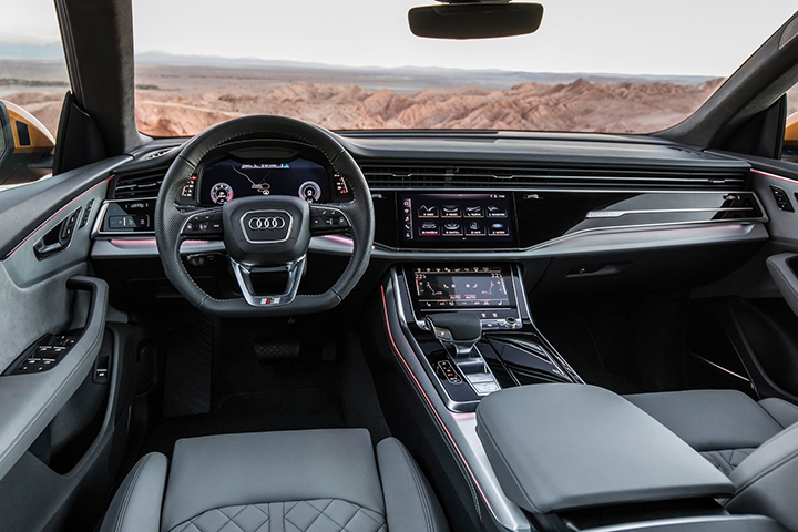 内饰沿用了奥迪目前旗舰产品的“虚拟座舱”布局,12.3英寸全液晶仪表加上10.1英寸+8.6英寸两块中控屏幕科技感非常强,并且变成触控式的空调控制面板实用性并不亚于传统的旋钮按键系统,同时还集成了其他功能让整个中控地台更为简洁。动力方面,奥迪Q8搭载3.0TSI涡轮增压发动机以及48V轻混动系统的组合,匹配8速手自一体变速箱,全系车型标配quattro四驱系统。