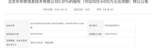 公告显示,北京车和家信息技术有限公司0.91%的股份将以829.5455万元的价格被转让,转让方为常州武南新能源汽车投资有限公司。