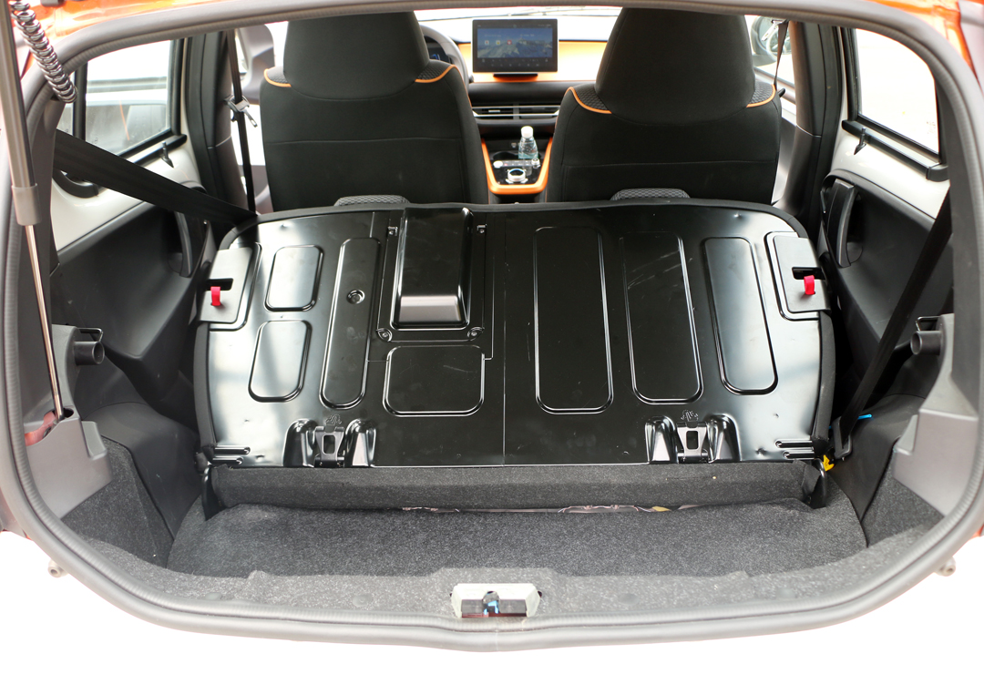 所幸的是,比亚迪e1的后排座椅支持整体放倒,且放倒后能获得一个相对理想的储物空间,应急时可装载体积较大物品,座椅放倒后,由于地台不算平整,对实用性有所影响。