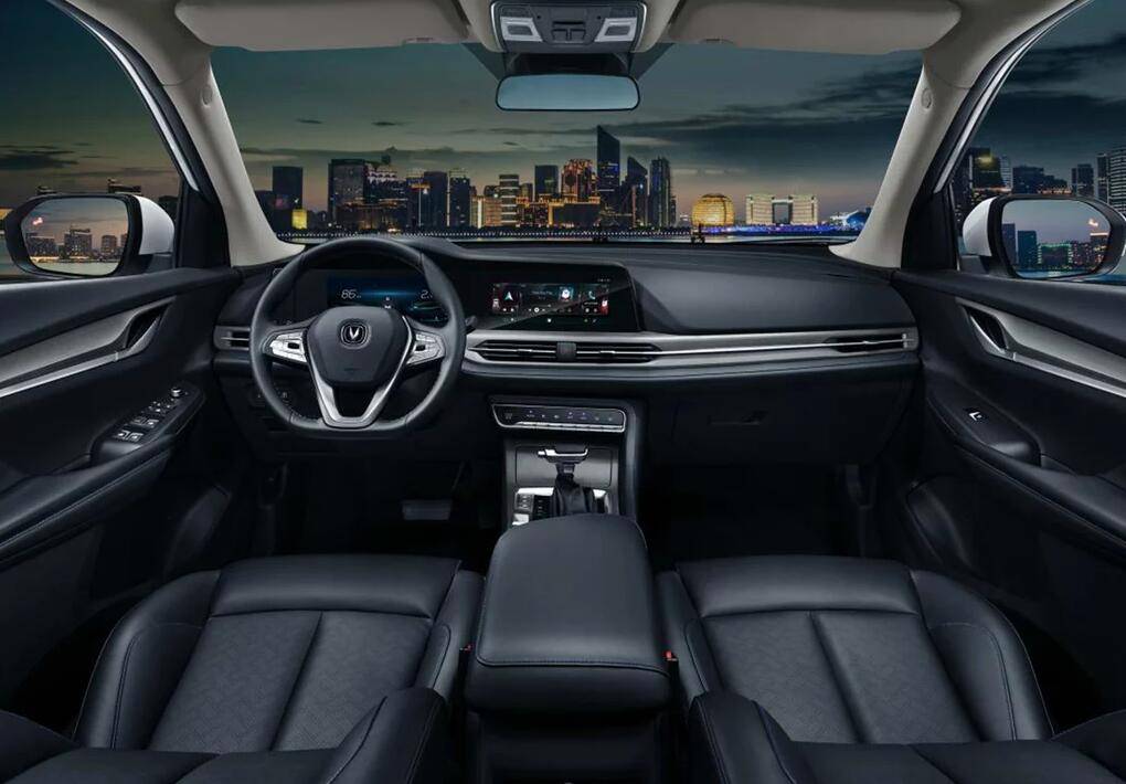 内饰方面,长安CS55 的整体内饰风格简洁大气,整体内饰大多采用了简单的设计线条,驾驶舱采用环抱式设计,中控设计偏向于主驾驶位,都是比较中规中矩的设计。值得一提的是长安CS55 的液晶仪表盘和中控大屏都采用了大尺寸设计,非常亮眼,为整个内饰增色不少。
